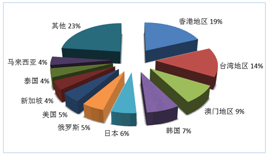 第三季度旅行社入境旅游接待人次排名前十位的客源地國家或地區(qū)由高到低依次為香港地區(qū)、臺灣地區(qū)、韓國、澳門地區(qū)、美國、俄羅斯、馬來西亞、日本、新加坡、泰國(見圖2)。